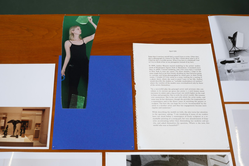The Sitter transforms Inspiration (XYZ Books, 2025) into a physical installation of paper, photographic prints, nails, and furniture. It features replicas of the chairs and couches used during photo sessions with models, transforming them into tiny microcosms of objectification. Through self-portraiture and photographs of models, Matilde Søes Rasmussen recreates the poses of the historical artist’s muse Audrey Munson. The work draws on Rasmussens archive of over 1000 analog darkroom prints made for the book.